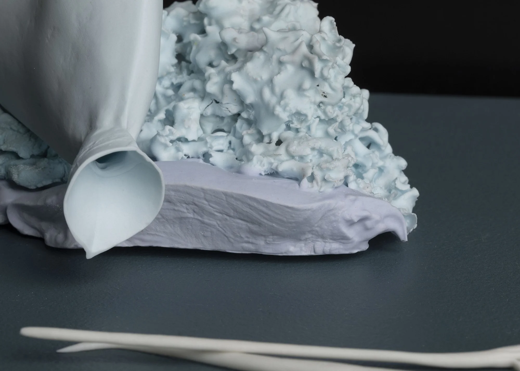 “I make small-scale objects in bone china and porcelain occasionally displayed with mixed media components. My artistic practice is a fusion of influences stemming from the still life painting genre, cabinets of curiosities and collage. I collect natural materials from local woodlands and man-made objects from a wide range of sources, which are then transformed, altered and restaged. These objects fuel my interest in the relationships between disharmony and ambiguity on the one hand and stillness and calm on the other.”