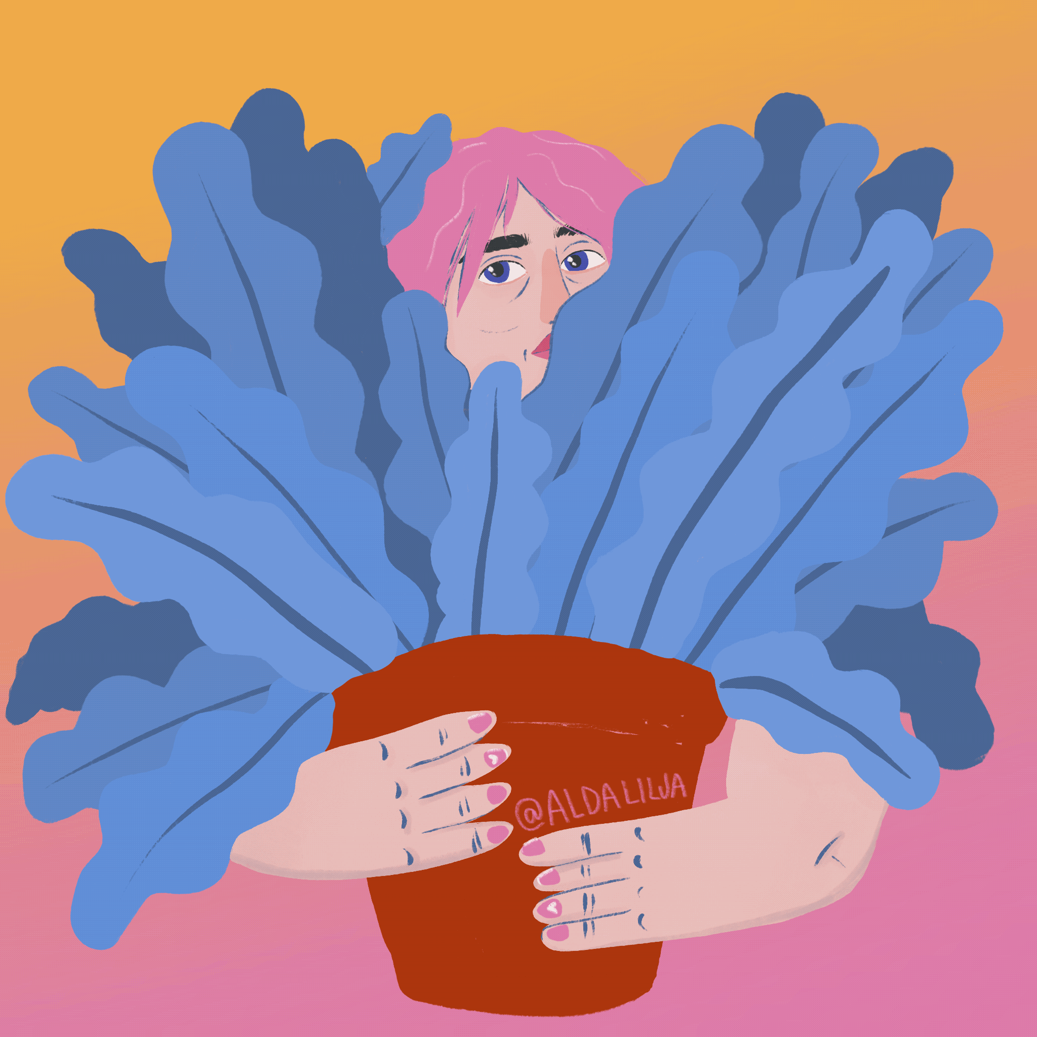 In her three works selected by Cluster, naked figures smile contently surrounded by autumn leaves and spring-time shoots. “I like to use plants as a symbol for self-growth,” Alda explains, “They need care, patience and light to grow – so do we.” In regards to her methods, Alda favours the flexibility that digital methods allow, using an Ipad and Procreate software as her weapons of choice. Though, she also enjoys experimenting in sketchbooks, “I use ink and graphite a lot and love it. I’ve done a lot of life drawing in the past, which definitely comes in handy when drawing people.”