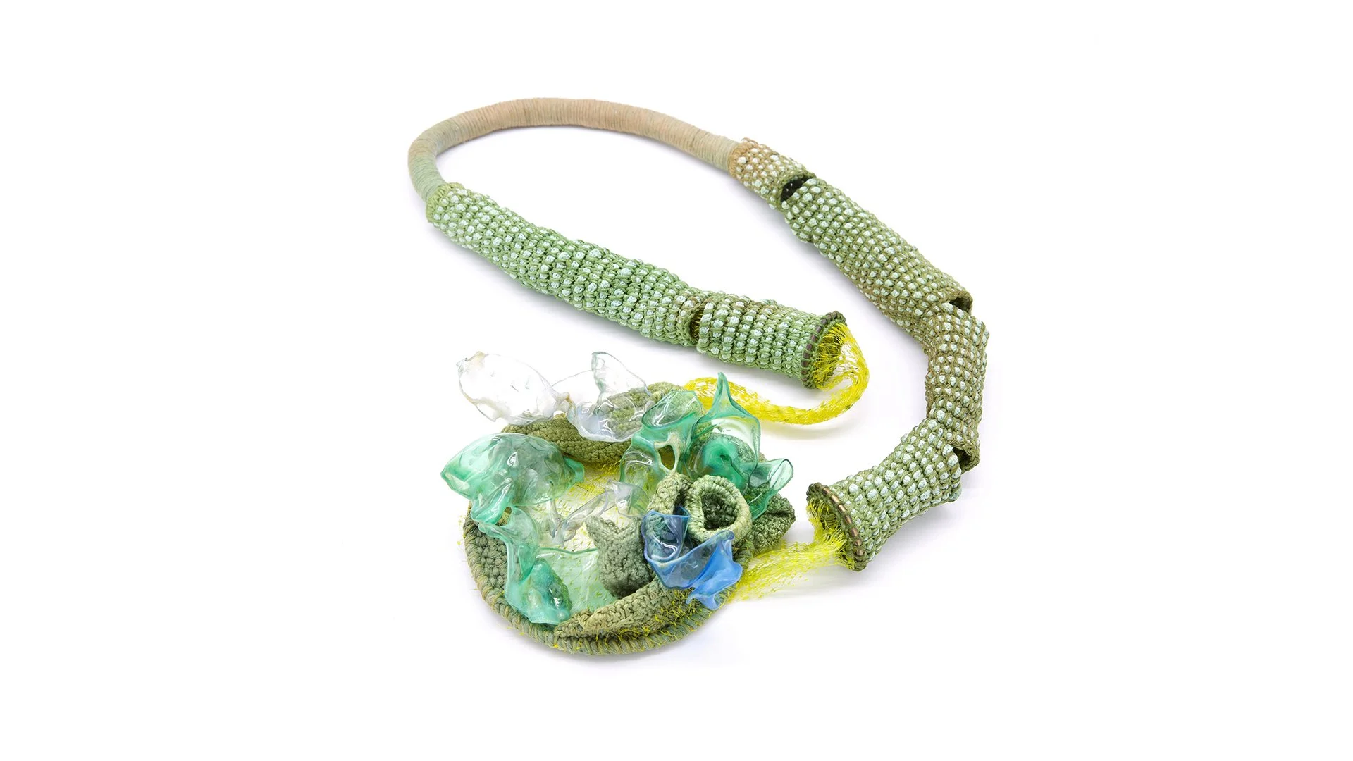 One of Patricia's pieces featured in the Cluster show is the pendant "The Emptiness of the Reflection" from the Mestizo Reflections Series. By weaving around a cord and melting plastic bottles, Patricia creates intricate stories that defy linear logic. This pendant challenges the idea of wearability and invites the wearer to be an accomplice and connect with its poetic essence.