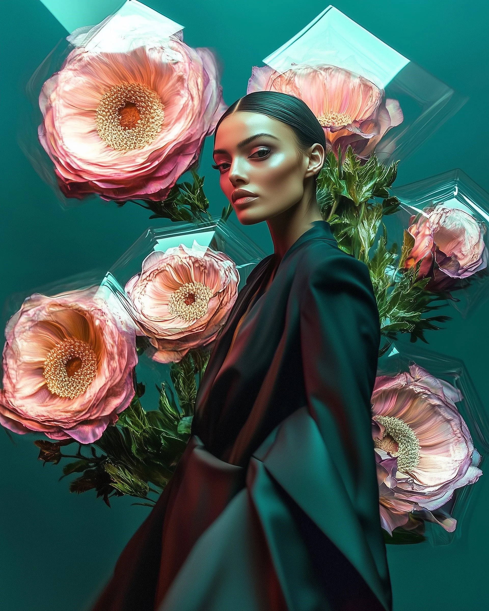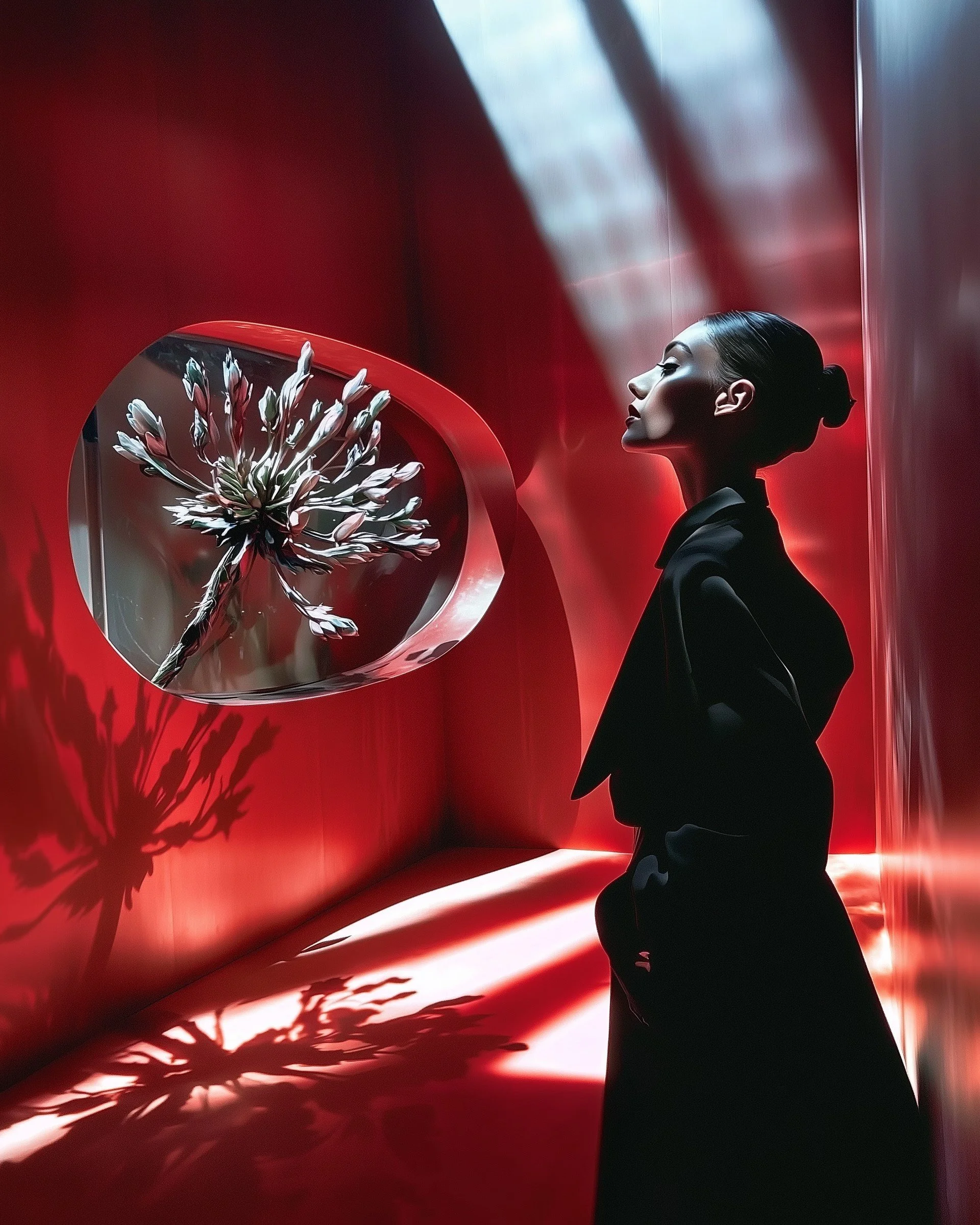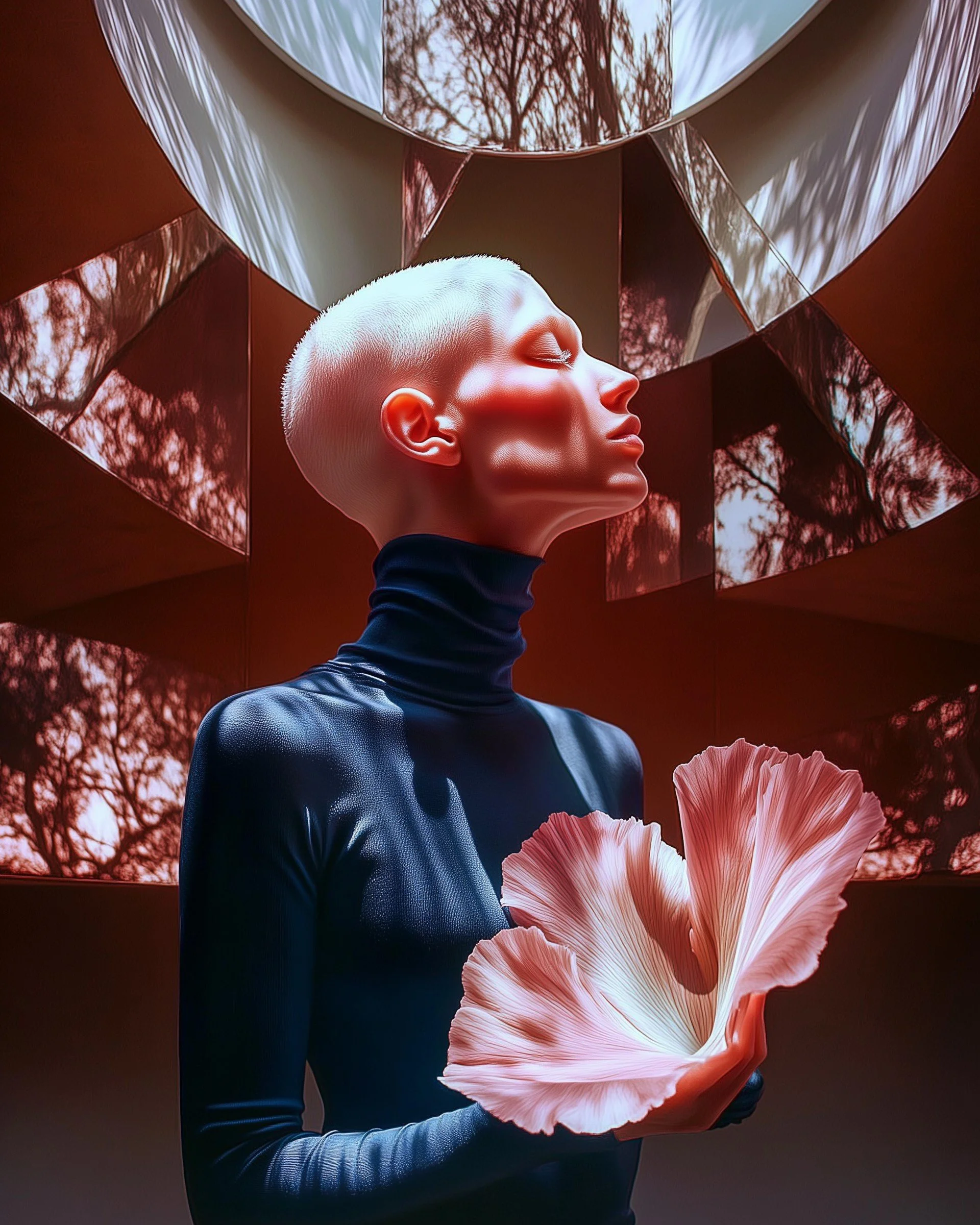 Nature remains her greatest muse. Growing up in the Ukrainian countryside, surrounded by diverse flora, she developed a deep appreciation for the organic world. Flowers and plants frequently appear in her work, serving as a bridge between the natural and the digital. Through AI-generated imagery, she explores the interplay of light and shadow, creating compositions that feel both ethereal and structured.
