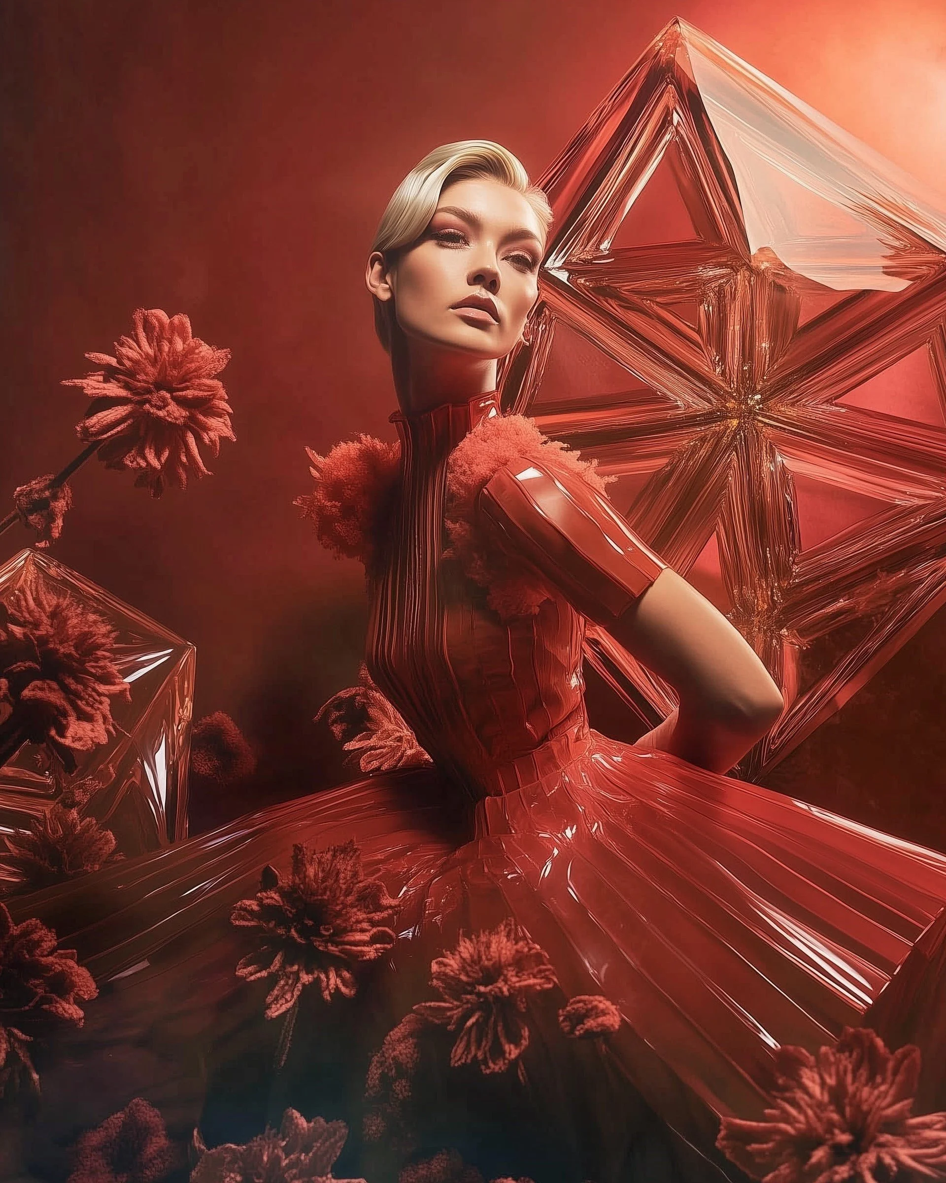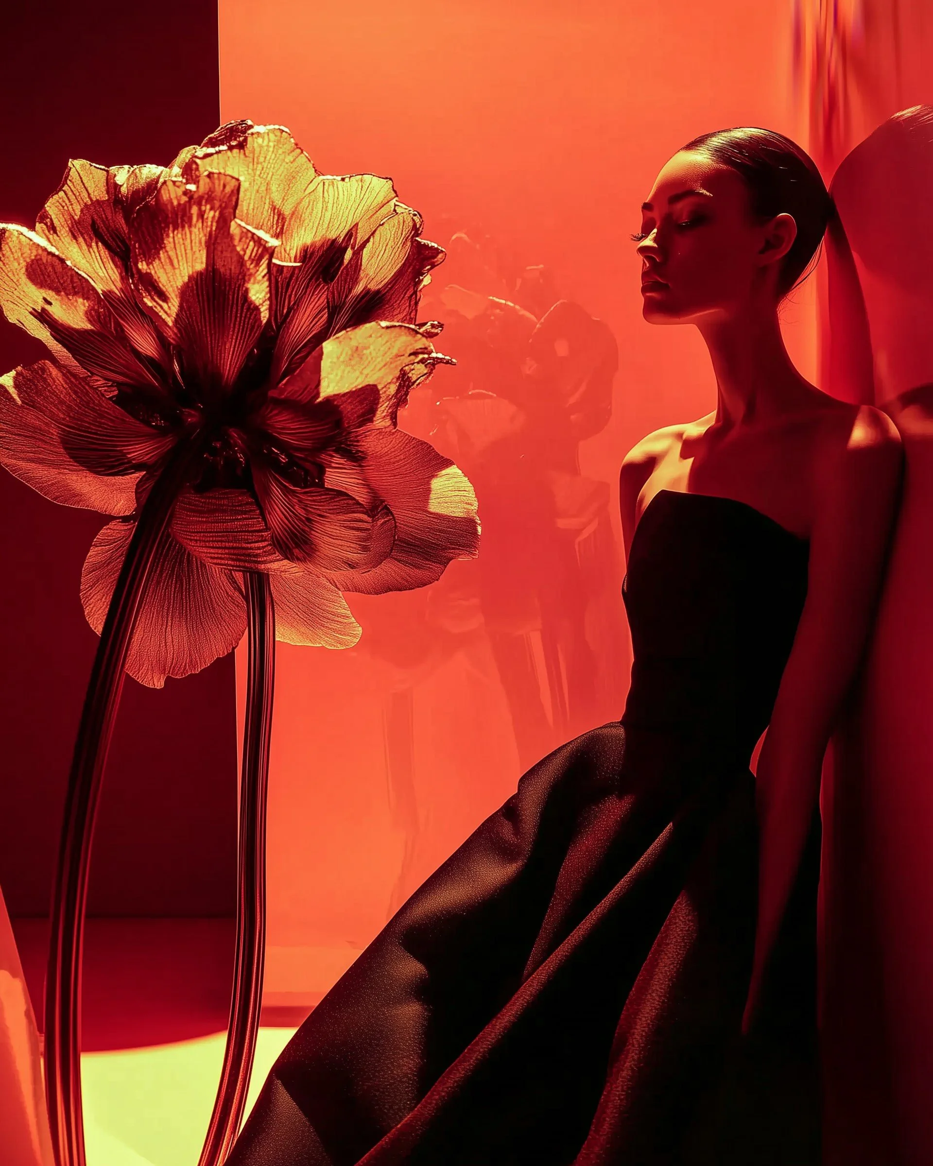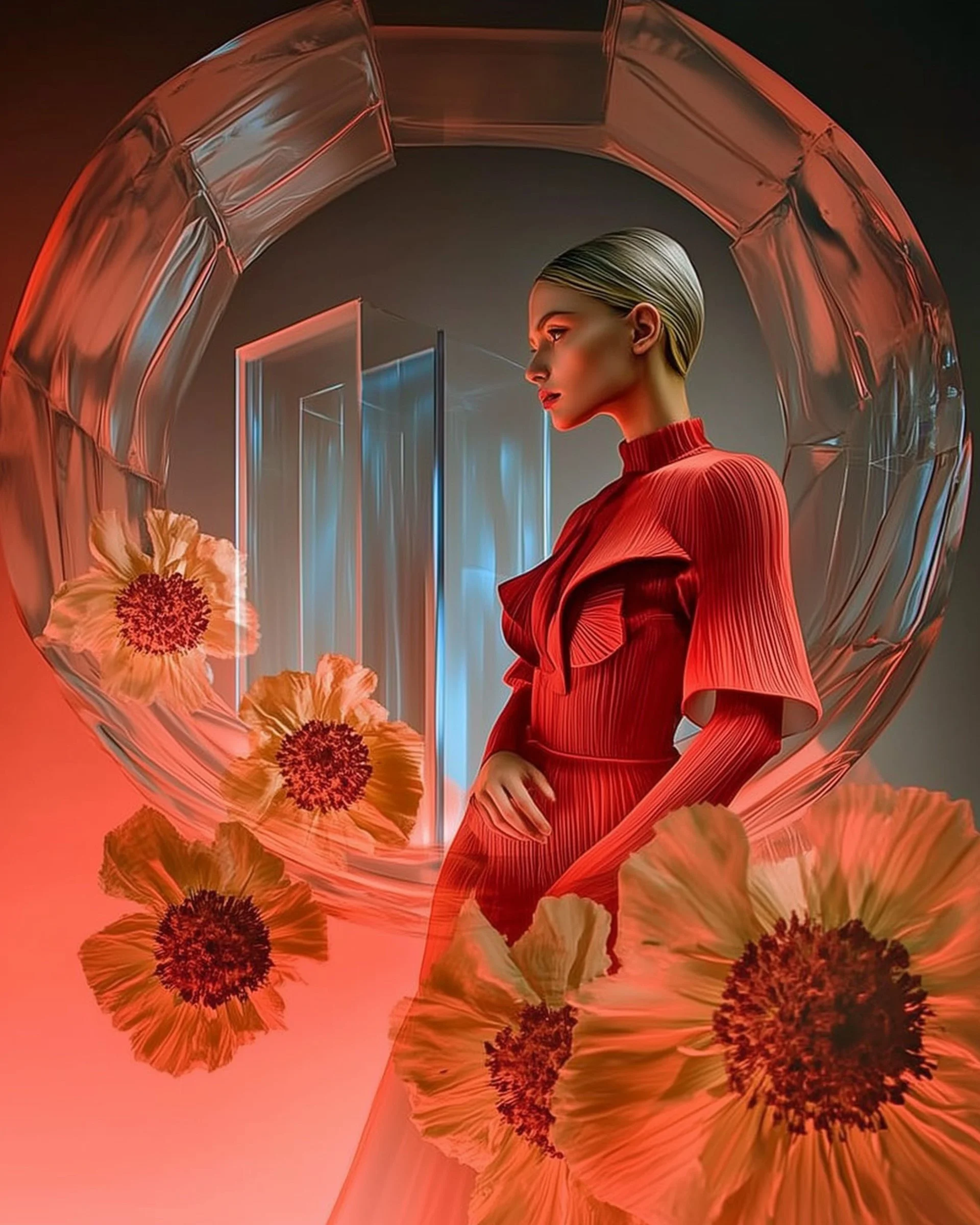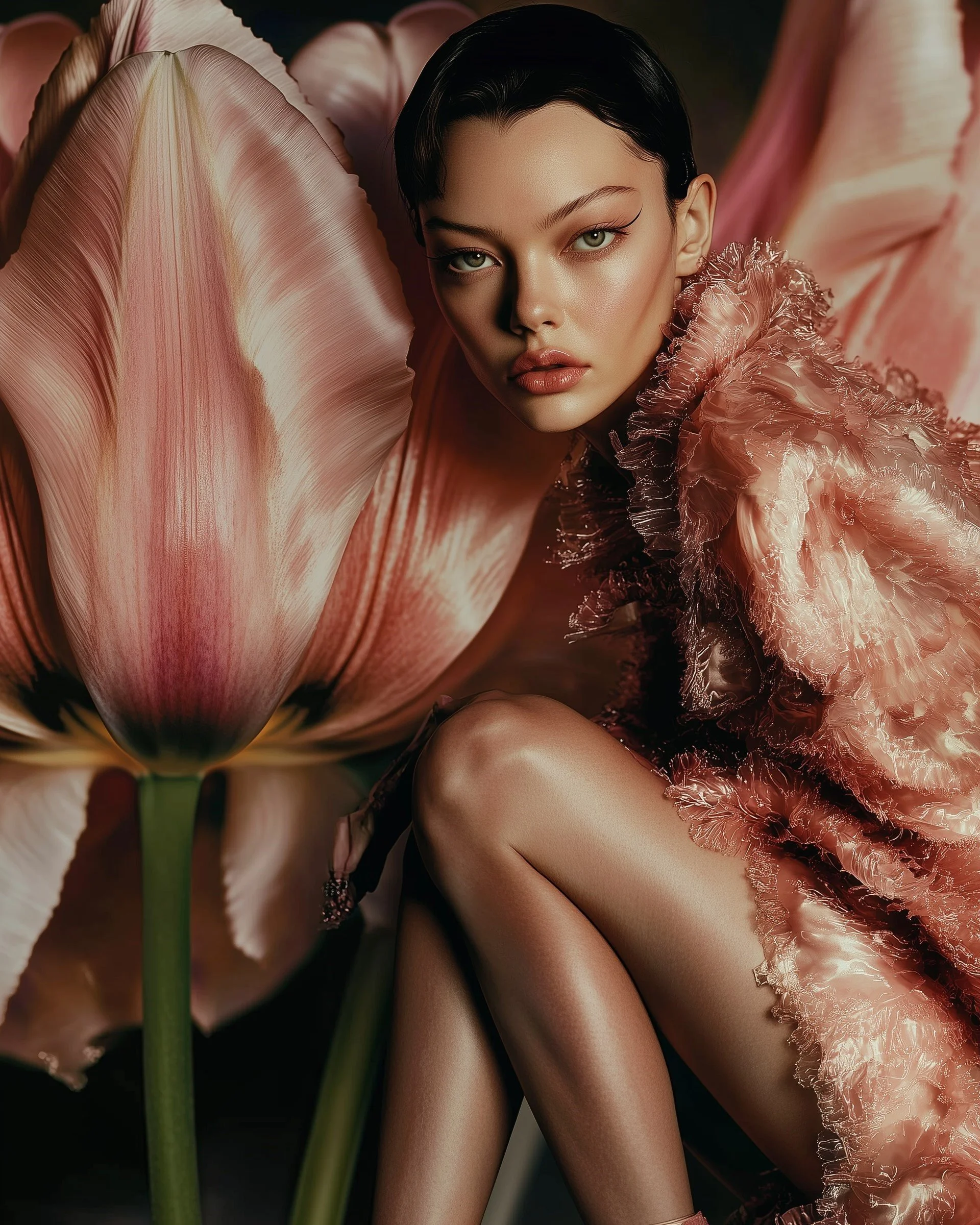 Nature remains her greatest muse. Growing up in the Ukrainian countryside, surrounded by diverse flora, she developed a deep appreciation for the organic world. Flowers and plants frequently appear in her work, serving as a bridge between the natural and the digital. Through AI-generated imagery, she explores the interplay of light and shadow, creating compositions that feel both ethereal and structured.