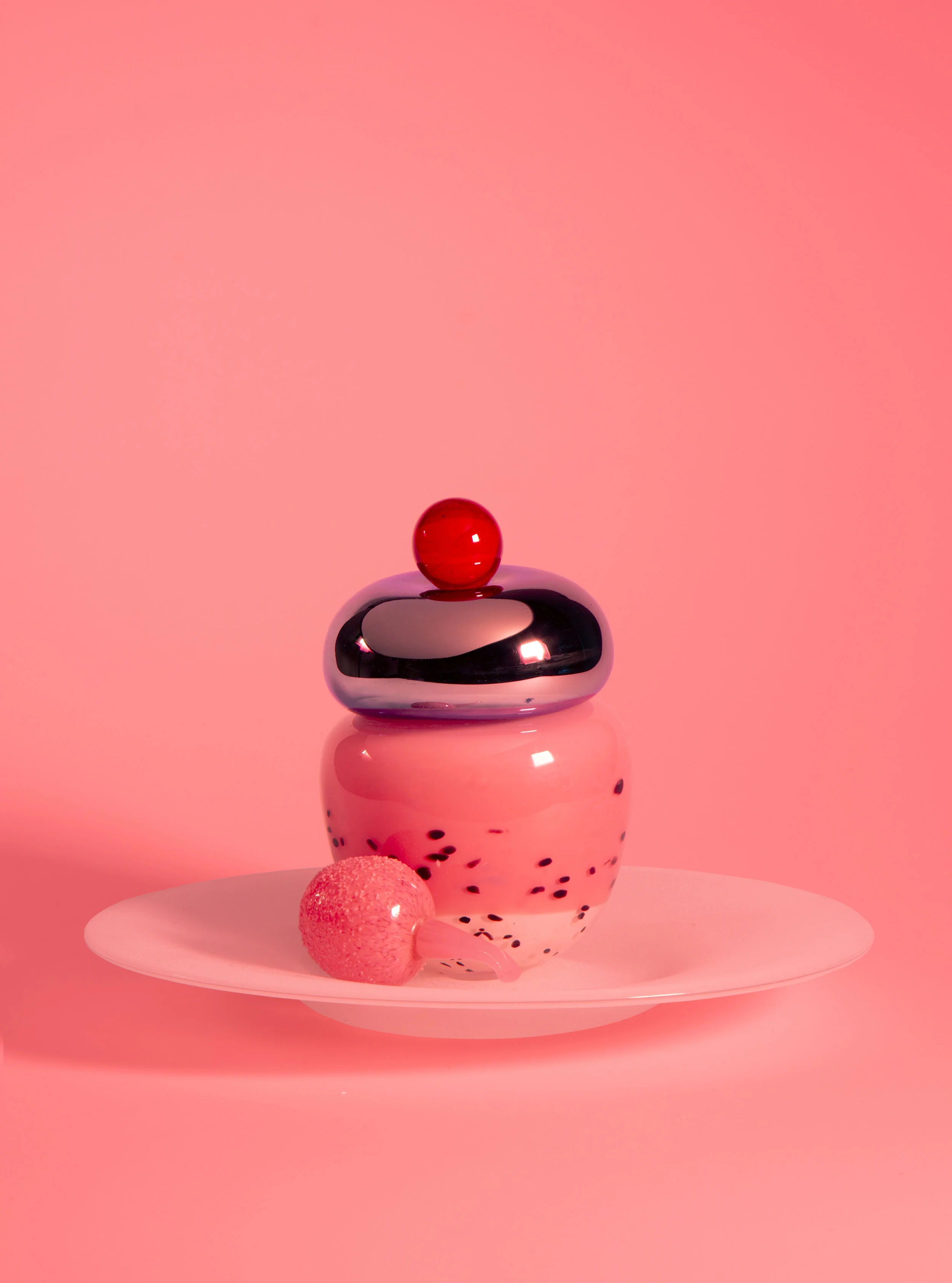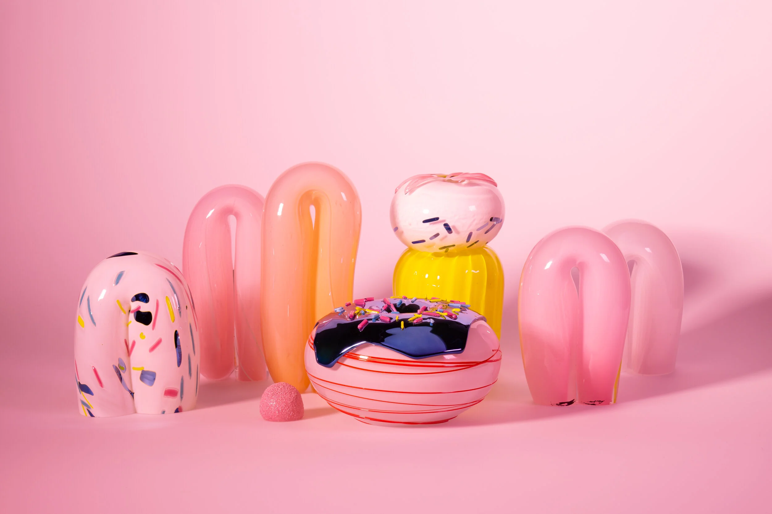The collection that forms part of Cluster’s current online exhibition and our curated design store is called Plastic Crush and is the largest collection that Erdem has launched so far. The inspiration was born of a whim that led to a series of curvaceous and bright glass donuts and cupcakes.