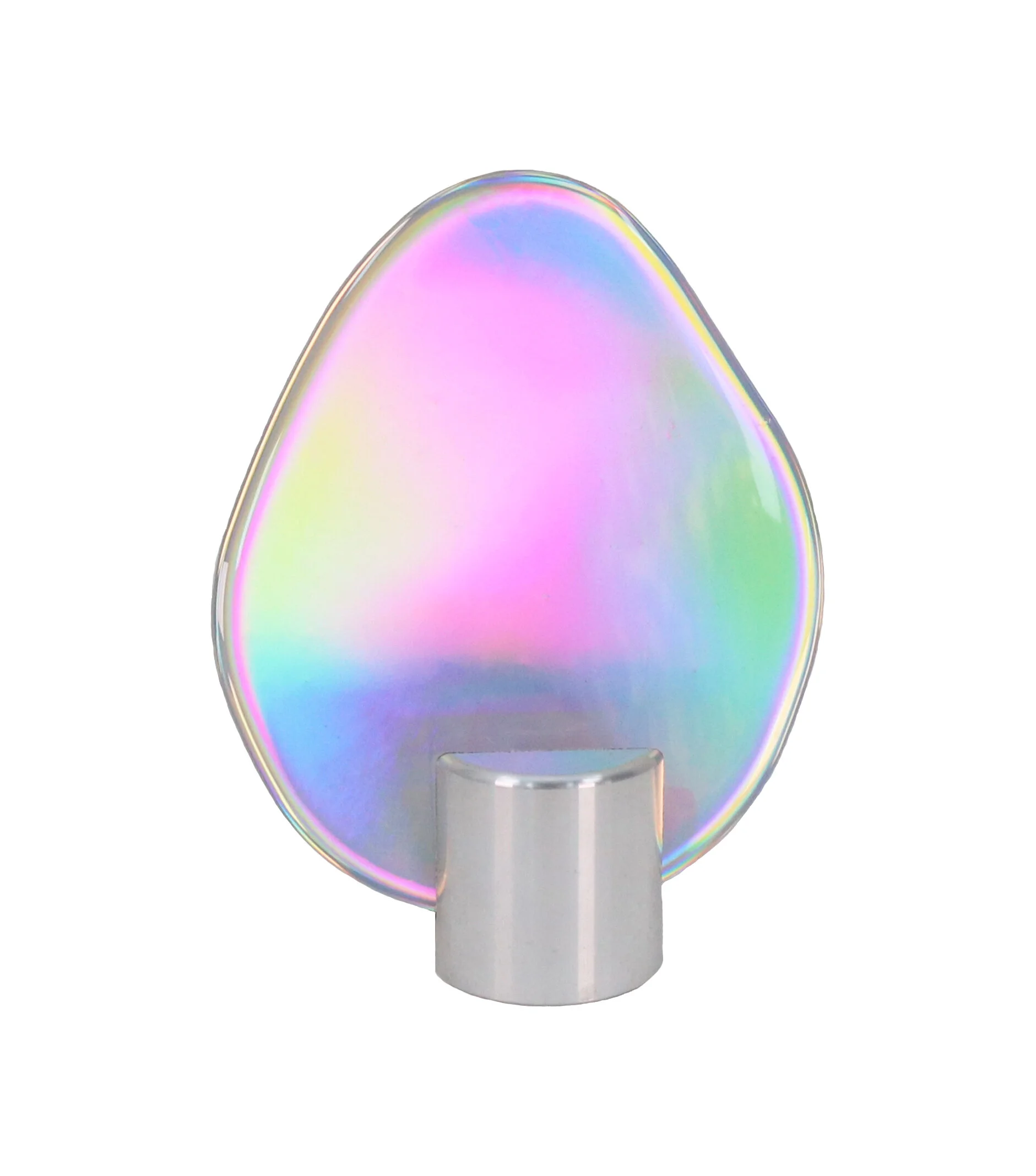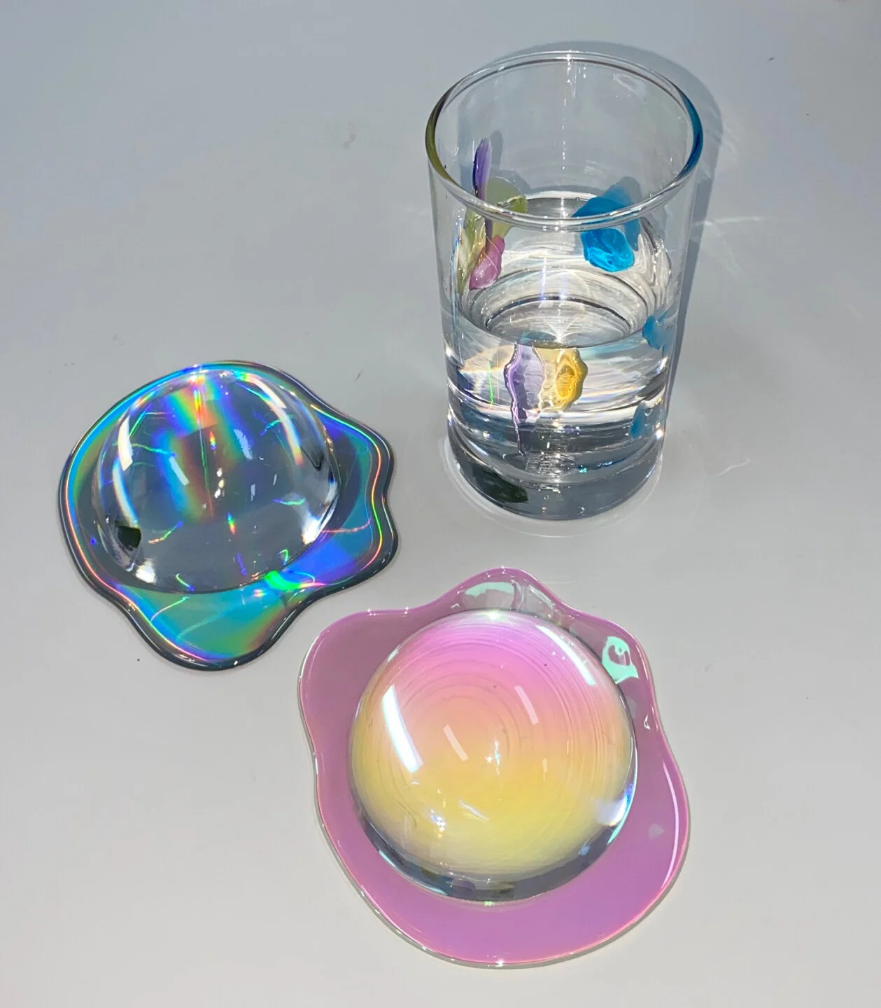 Kaya’s studio began with a focus on digital design and film. The collection of Rainbow Coasters, which is now part of Cluster Craft’s digital exhibition and shop, was her first foray into product design. The coasters are made of resin and have shimmering holographic colours. The pearlescent shades and periwinkle blues have a soothing effect, shifting and changing with the light.