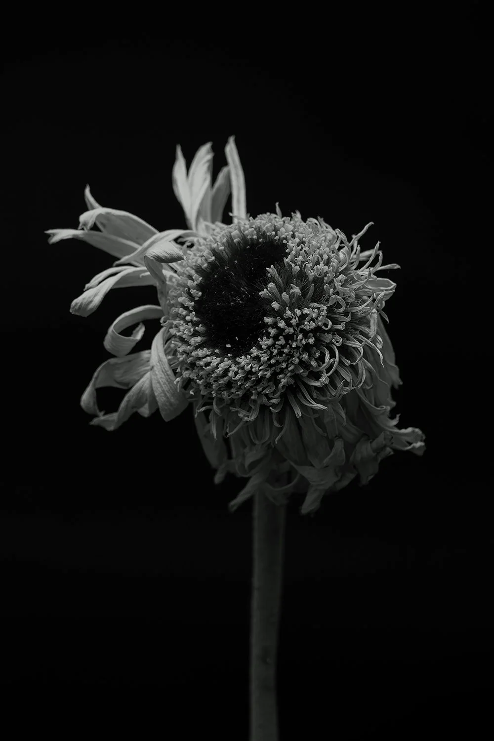 In this new series, I photograph wilting sunflowers—symbols of warmth, happiness, and positivity. By stripping away all colour, I focus on my grief, creating a visual narrative that allows me to express my emotions without uttering a word. This project serves as a powerful means of processing my loss, enabling me to articulate my experiences of grief and healing. Through my lens, I aim to convey the enduring beauty that can emerge from decay, inviting viewers to reflect on their own journeys of loss and resilience.”