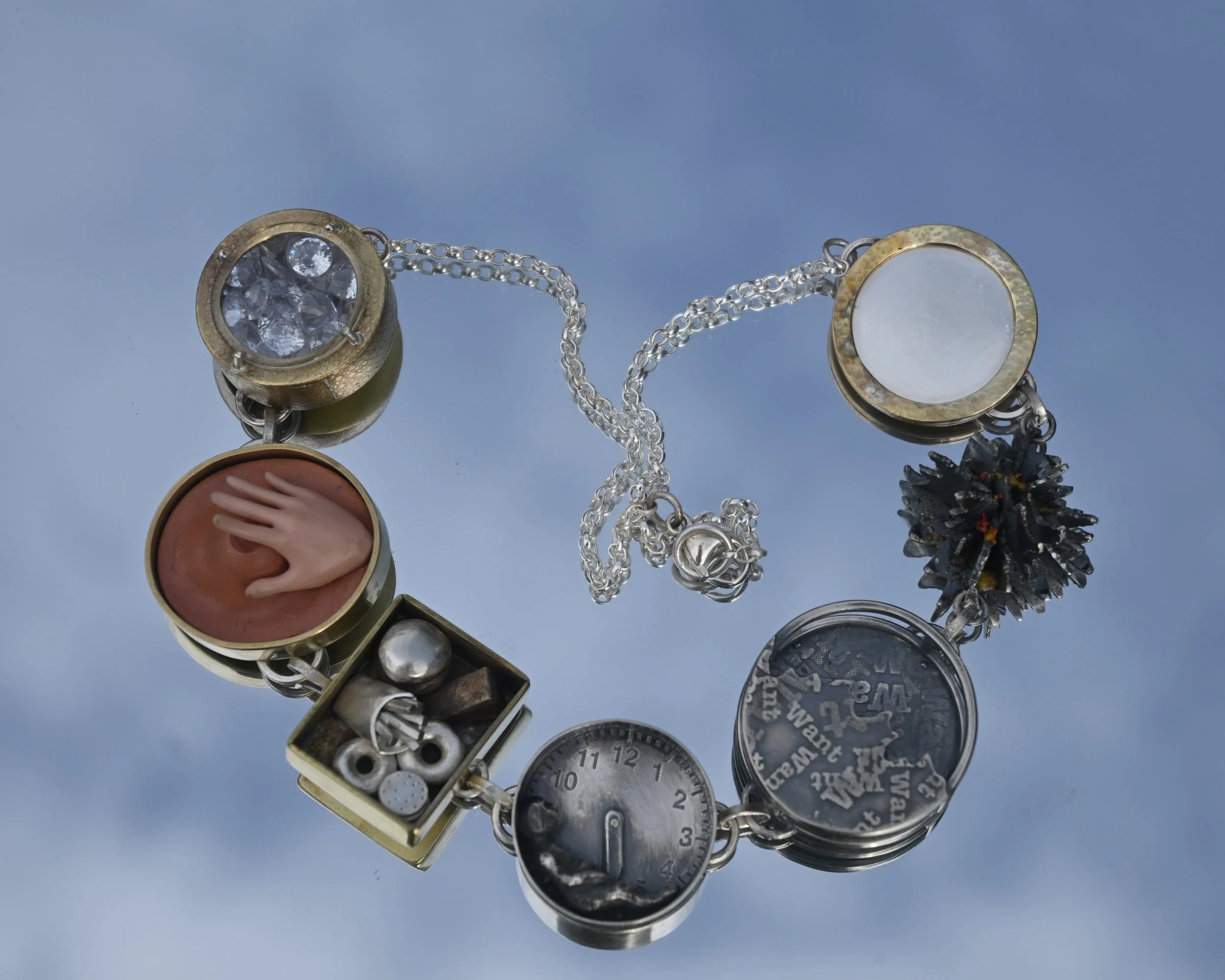 More recently, driven in part by increases in precious metal prices, he has experimented with non-precious metals and recycled and found materials, raising new challenges to his commitment pieces that last, and leading to exploration and development of techniques and materials that are wider than those of conventional jewellery making.