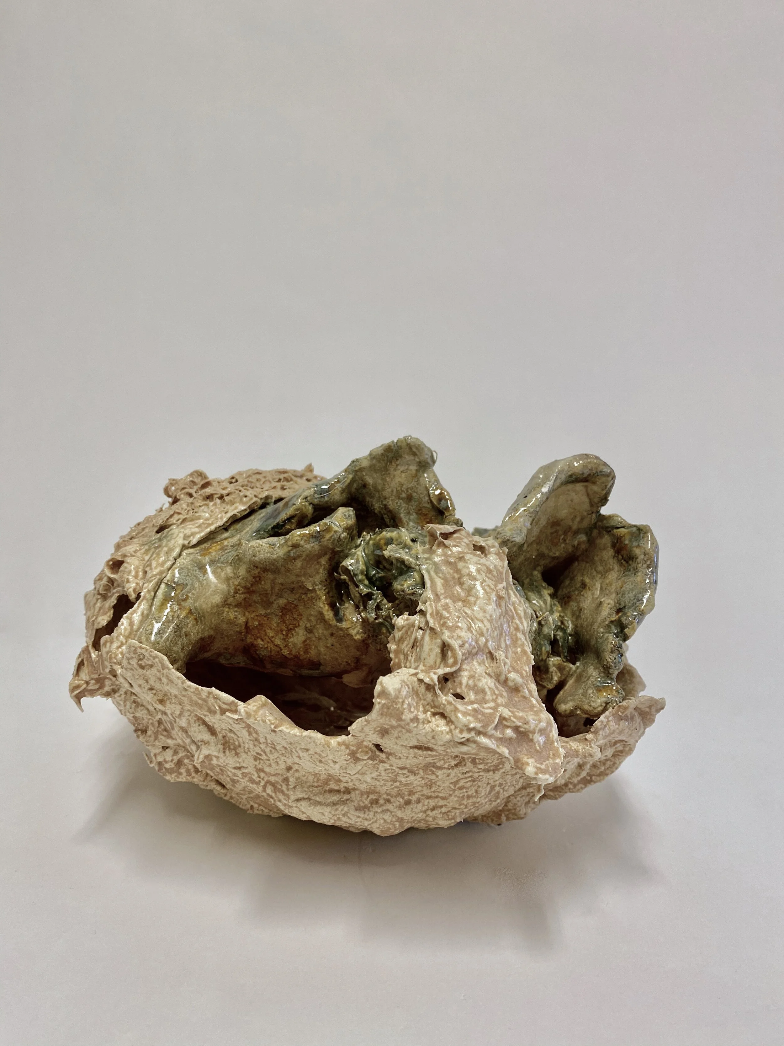 Part of her artistic process is the exploration of clay at different stages of its material journey: unfired, bisque fired, high-fired, glazed and unglazed. At all these different stages she looks at the qualities that the clay manifests, such as fragility, colour and density. She integrates different natural materials into her work.