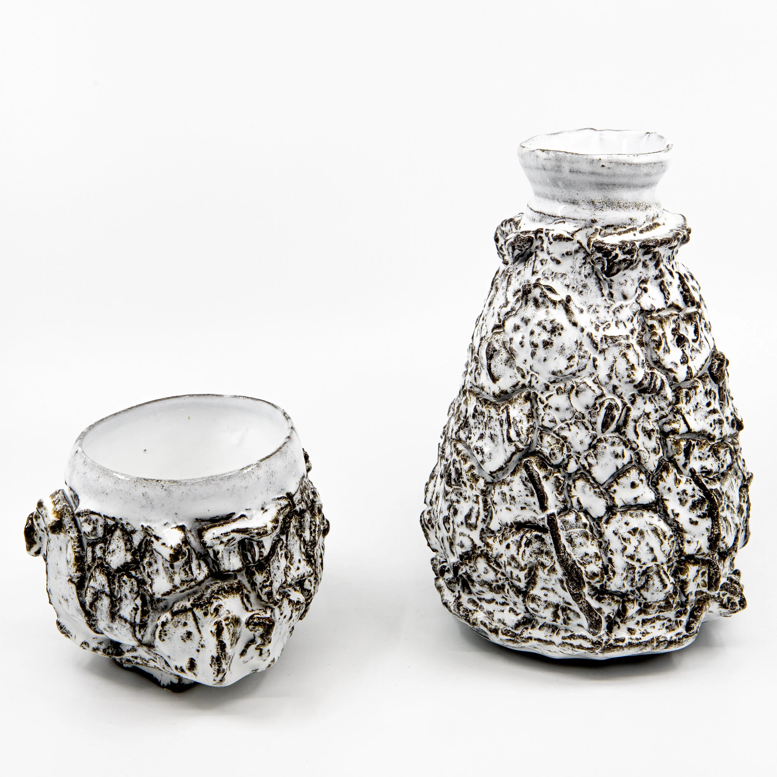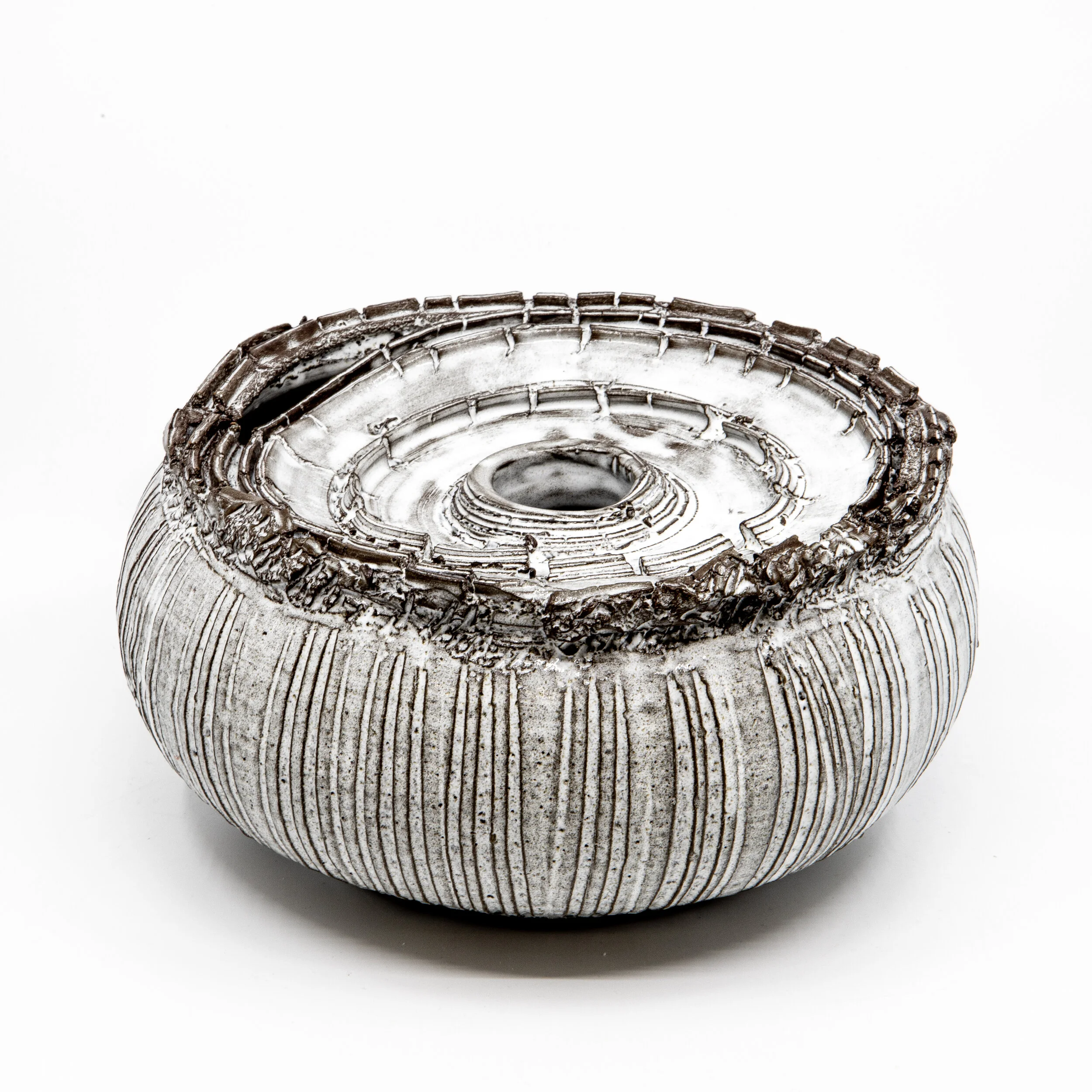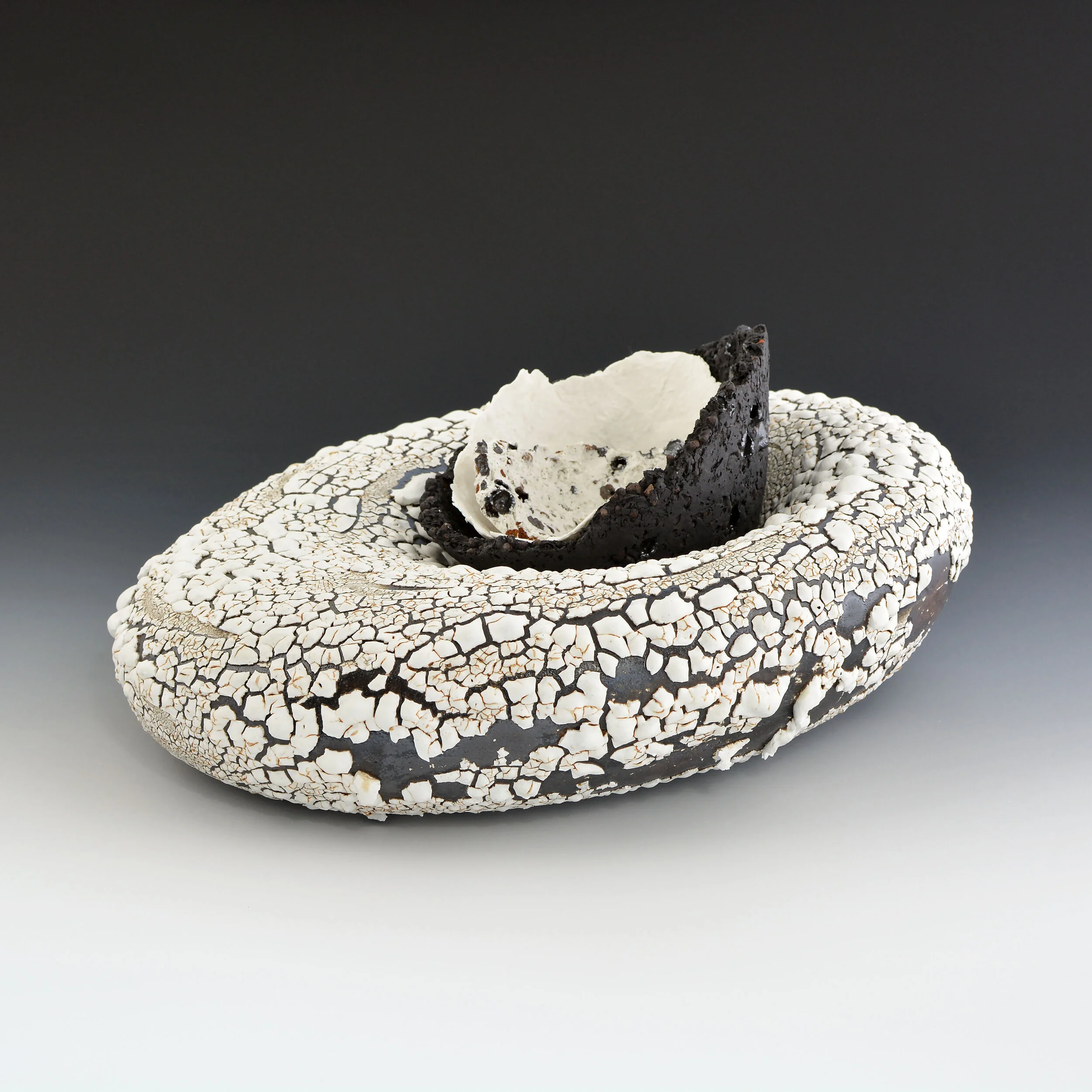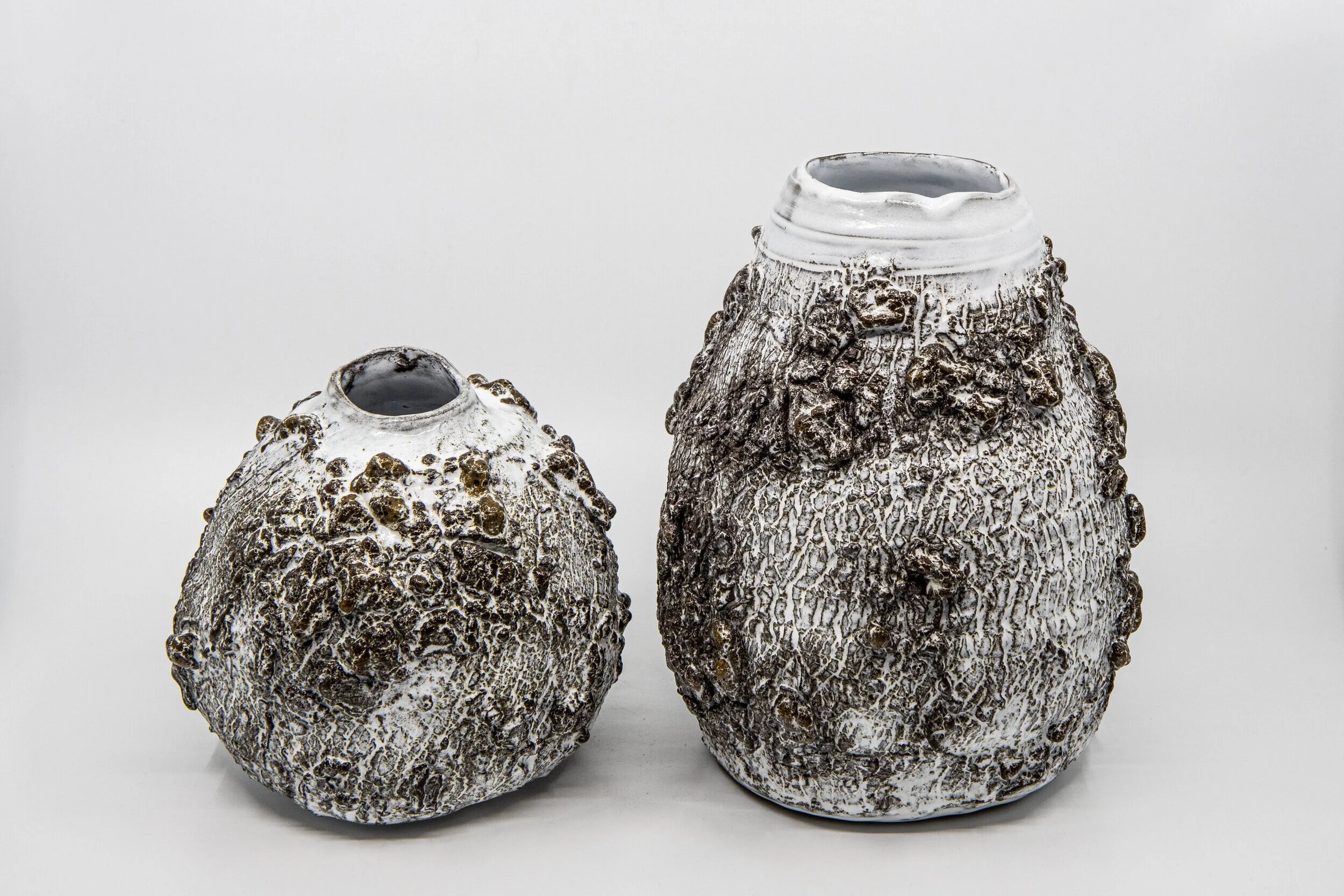 The strange, highly textured surfaces of the pieces are created in the raw clay stage with the addition of other ingredients, such as paper, pumice, metal filings and glass granules. These create surprising effects, somewhat like the bark of a tree or barnacles against a rock.